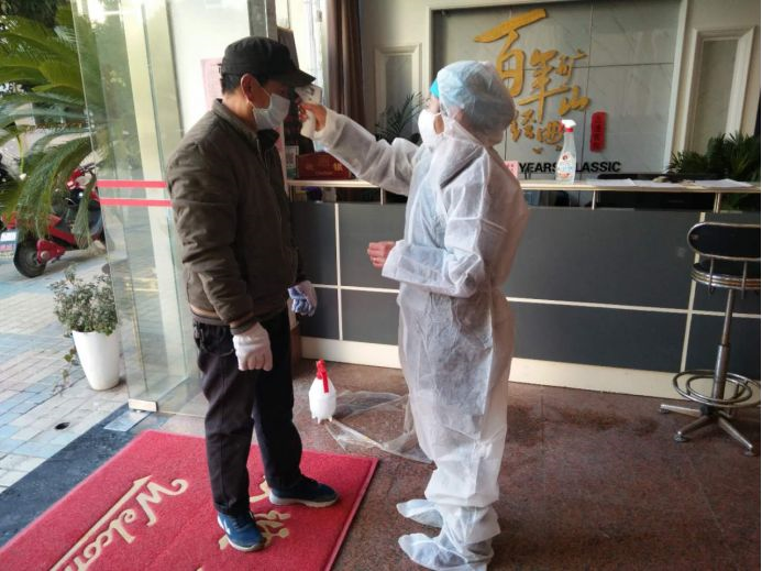 四醫(yī)院冶礦路社區(qū)康養(yǎng)中心華杉正在給下班回賓館的醫(yī)務(wù)人員消毒