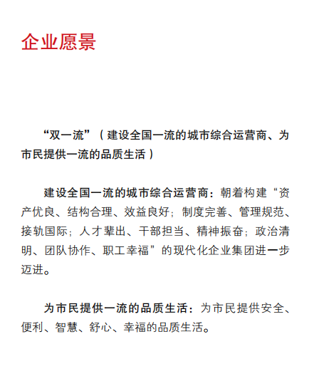 企業(yè)愿景:“雙一流”(建設(shè)全國(guó)一流的城市綜合運(yùn)營(yíng)商、為市民提供一流的品質(zhì)生活)