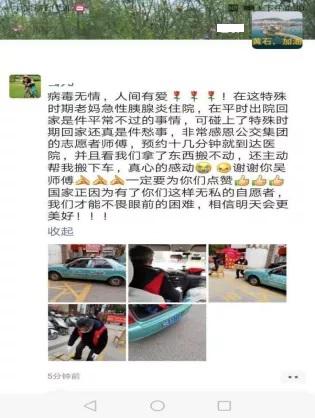 愛心車隊不僅任務(wù)重,還存在較高的感染風(fēng)險。吳海入當(dāng)然也有顧慮,但他仍然選擇了義無反顧。每當(dāng)有出車任務(wù)時,他總是搶著上;當(dāng)病人有行李時,他主動下車幫病人把行李搬上車;當(dāng)病人行走不便時,他熱心上前攙扶病人上車;遇到有特殊困難的,他甚至特意到病人家門口將其背下樓坐上車……這一系列的暖心善舉讓乘客紛紛為他點贊。