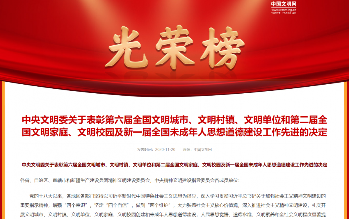 11月20日,《中央文明委關于表彰第六屆全國文明城市、文明村鎮(zhèn)、文明單位和第二屆全國文明家庭、文明校園及新一屆全國未成年人思想道德建設工作先進的決定》正式公布。黃石市自來水有限公司被授予“全國文明單位”榮譽稱號。
