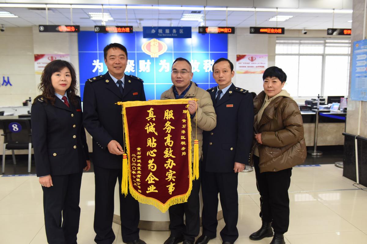 12月16日上午,城發(fā)置業(yè)(停車、教育)公司總經(jīng)理程勇向黃石港區(qū)稅務(wù)局送去一面錦旗,感謝黃石港區(qū)稅務(wù)局幫助公司享受增值稅期末留底稅額退稅優(yōu)惠政策,實(shí)現(xiàn)退稅590萬元。