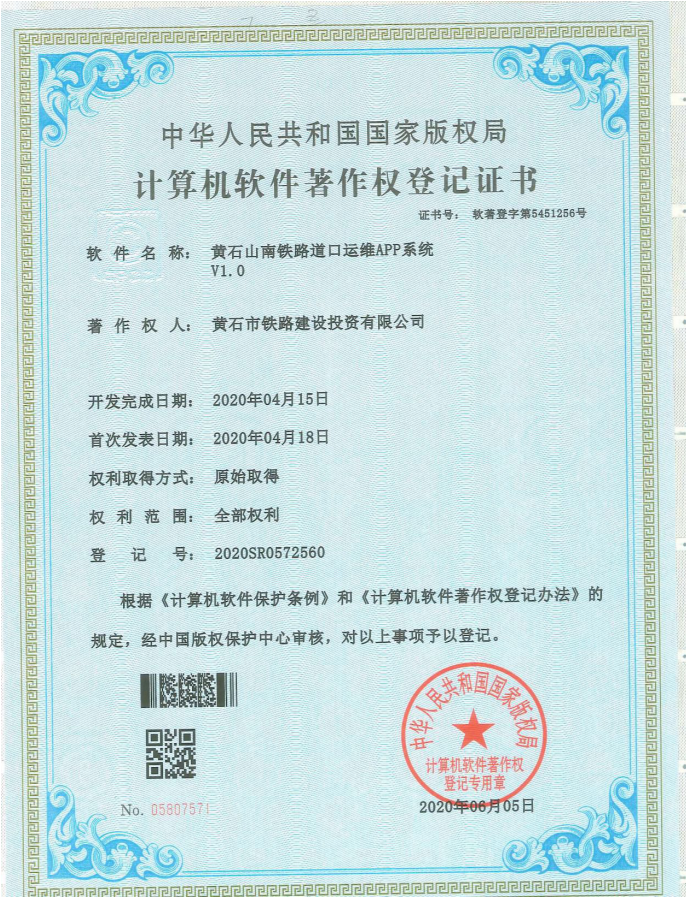 黃石山南鐵路道口無人值守技術(shù)共申請國家級8項專利技術(shù) ,其中《黃石山南鐵路道口智能化控制系統(tǒng)》、《黃石山南鐵路道口列車車載聯(lián)動顯示系統(tǒng)》、《黃石山南鐵路道口調(diào)度中心綜合監(jiān)管系統(tǒng)》、《黃石山南鐵路道口運維APP系統(tǒng)》4項成果已取得計算機軟件著作版權(quán)登記。